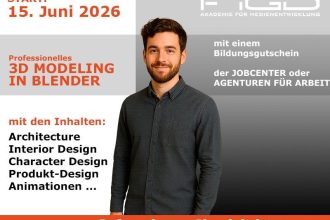 Digitale 3D-Welten spielen heute eine zentrale Rolle in Architekturvisualisierung, Games, Filmproduktion, Produktdesign und interaktiven Medien. Unternehmen suchen zunehmend Fachkräfte, die komplexe Modelle erstellen, Szenarien entwickeln und Animationen produzieren können. Genau hier setzt die Weiterbildung „3D Modeling in Blender“ der FiGD Akademie an. Der dreimonatige Vollzeitkurs startet am 15. Juni 2026 und vermittelt praxisnah die Grundlagen […]