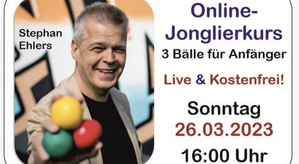 Lernen Sie in verblüffend kurzer Zeit das Jonglieren mit 3 Bällen … bei Deutschlands erfolgreichstem Jongliertrainer. Nach dem Kurs kann man allein weiterüben… dazu gibt es hinterher für alle Teilnehmer Hinweise und Links zu kostenfreien Video-Tools und Lern-Apps. Die Teilnahme an diesem Online-Workshop ist KOSTENFREI!