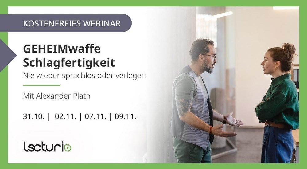 In diesem kostenfreien Webinar mit Rhetorik-Experte Alexander Plath erfahren Sie, mit welchen Mitteln Sie in Diskussionen nie wieder sprachlos bleiben, sondern elegant und schlagfertig auf die Argumente Ihres Gegenübers reagieren.