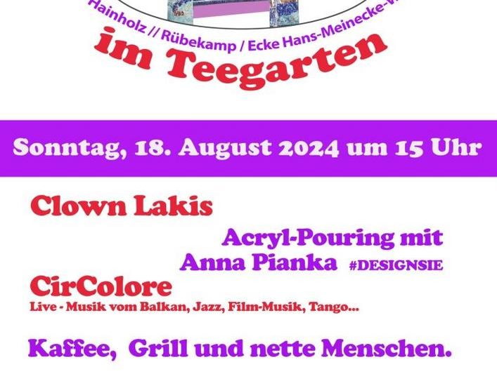 Der Verein Miteinander für ein schöneres Viertel – MSV e.V. richtet ein Sommerfest im Teegarten in Hannover Hainholz aus. Am Sonntag, dem 18.08.2024 um 15 Uhr startet das Sommerfest, bei welchem das vielfältige Sommer-Programm seinen Abschluss findet. Mit Kaffee und Kuchen, Live-Musik von CirColore, dem lustigen Clown Lakis, Grillspezialitäten, Spielen und einem Acrylpouring-Workshop mit Anna Pianka gibt es viel Spaß für Groß und Klein.