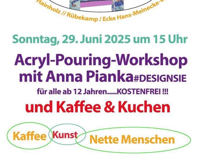 Am Sonntag, den 29. Juni 2025, lädt der MSV Hannover e.V. zum Event “Kaffee & Kunst im Teegarten” zu einem besonderen Acryl-Pouring-Workshop ein. Die Veranstaltung findet in der Rübekamp / Ecke Hans-Meineke Weg statt. Interessierte ab 12 Jahren sind herzlich willkommen, ab 15:00 Uhr gemeinsam mit der Künstlerin Anna Pianka die Technik des Acryl-Pouring kennenzulernen und eigene Kunstwerke zu erschaffen. Die Teilnahme ist kostenfrei! Acryl-Pouring ist eine Maltechnik, bei der Acrylfarben mit verschiedenen Medien vermischt und auf eine Leinwand gegossen werden.
