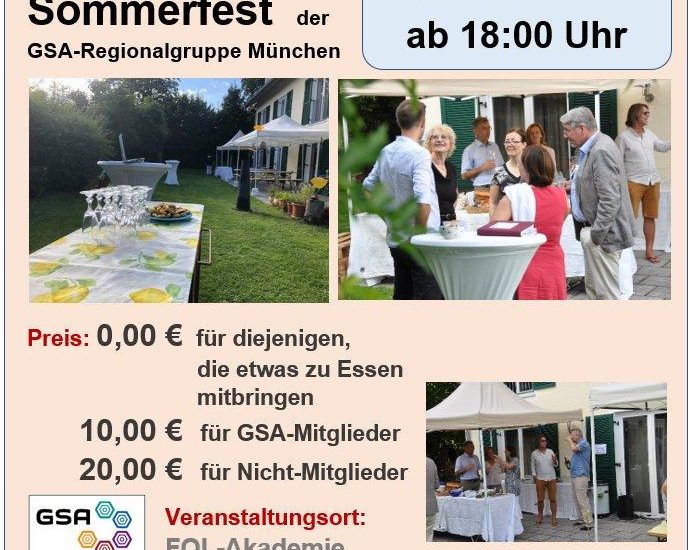 Das Sommerfest findet in einem Garten in München (Nymphenburg/Gern) statt. Es werden sowohl Stehtische als auch Bierbänke/Tische zur Verfügung stehen. Im Vordergrund des Sommerfest steht der ungezwungene Austausch untereinander. Jeder Gast kann/darf nicht nur seine/n Partner/in sondern auch etwas zu essen mitbringen (Salat, Salziges oder Süßes) … und kann dann kostenfrei beim Sommerfest dabei sein. Wer nichts mitbringt, zahlt als GSA-Mitglied 10,00 € und Nicht-Mitglieder zahlen 20,00 €. Alle Preise sind inkl. Essen und Getränke (!).