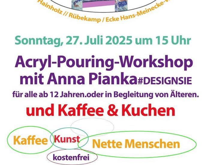 Im Mittelpunkt steht ein Acryl-Pouring-Workshop mit der Künstlerin Anna Pianka (#DESIGNSIE), bei dem Teilnehmer*innen ihrer Kreativität freien Lauf lassen können. Die moderne Maltechnik „Acryl Pouring“ begeistert durch ihre lebendigen Farben und faszinierenden Fließeffekte – und ist auch für Einsteiger*innen bestens geeignet.