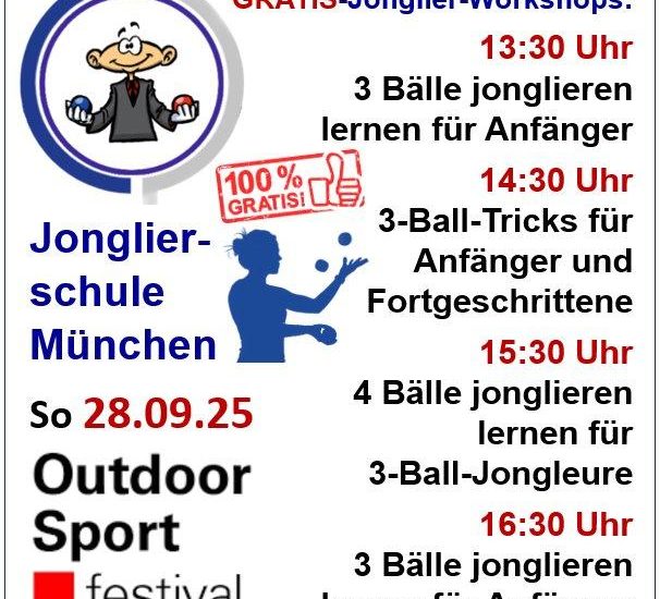 Am Sonntag, 28. September, verwandelt sich der Olympiapark München wieder in eine riesige Outdoorsport-Arena. Zum achten Mal warten beim Outdoorsportfestival den ganzen Tag über mehr als 50 Outdoor-Aktivitäten darauf, kennengelernt, getestet und vor allem direkt ausprobiert zu werden! Die Jonglierschule München ist als Aussteller dabei und bietet verschiedene GRATIS -Jonglier-Workshops für verschieden Zielgruppen an: