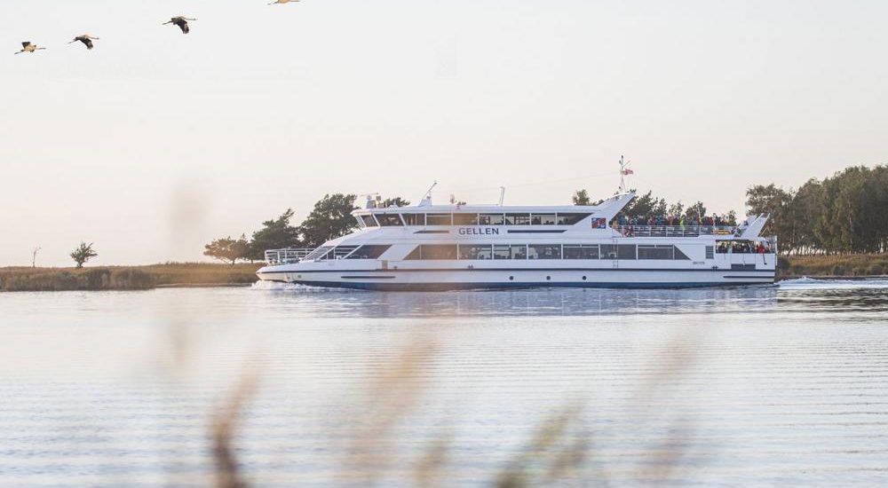 Die beeindruckenden Kranichfahrten der Weißen Flotte gehen in die nächste Runde. Die Abfahrtshäfen in dieser Saison sind Breege, Stralsund, Schaprode und Zingst. Los geht es traditionell ab Mitte September. Zum bekannten Beobachtungspunkt Pramort im Nationalpark Vorpommersche Boddenlandschaft führen die großen Kranichfahrten mit einer Dauer von jeweils ca. 4 Stunden. Diese starten einmal pro Woche ab Stralsund mit MS Altefähr, ab Schaprode mit MS „Gellen“ sowie zweimal wöchentlich ab Zingst mit MS „Sundevit“. Von der Insel Hiddensee besteht ein Zubringer zur Abfahrt in Schaprode. Ebenfalls ab Zingst bietet MS „Swantevit“ zwei Mal wöchentlich die Möglichkeit für kürzere Touren zu den Beobachtungspunkten zwischen der Insel Kirr und der Meiningenbrücke. Von Breege aus lädt das Fahrgastschiff MS „Wappen von Breege“ zwei Mal pro Woche zu intensiven Beobachtungen der majestätischen Vögel am Zielort vor Spyker im großen Jasmunder Bodden ein.