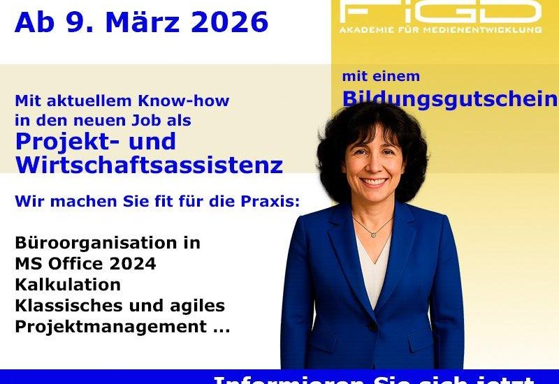 Organisationstalent, Kommunikationsstärke und ein sicherer Umgang mit modernen Büro-Tools sind Schlüsselqualifikationen in der heutigen Arbeitswelt. Die Weiterbildung „Projekt- und Wirtschaftsassistenz“ der FiGD Akademie vermittelt in nur drei Monaten genau diese Kompetenzen – kompakt, praxisnah und voll förderbar. Der Starttermin ist der 09.03.2026. Die Qualifizierung richtet sich an Menschen, die beruflich (wieder) einsteigen, sich neu orientieren oder ihre Assistenzkompetenzen gezielt ausbauen möchten.