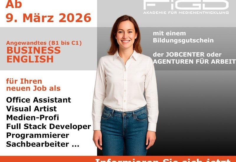 Gute Englischkenntnisse sind heute in fast allen Berufsfeldern ein klarer Vorteil – ob im direkten Kundenkontakt, in der internationalen Korrespondenz oder bei Videomeetings mit Partnern aus dem Ausland. Wer seine Sprachkompetenz gezielt für den Berufsalltag ausbauen möchte, findet mit der Weiterbildung „Englisch“ der FiGD Akademie den idealen Einstieg. Der Intensivkurs startet am 09.03.2026 in Berlin und dauert rund drei Monate. In dieser Zeit lernen die Teilnehmenden, wie sie sich im wirtschaftlichen Umfeld sicher, flüssig und situationsgerecht auf Englisch verständigen.
