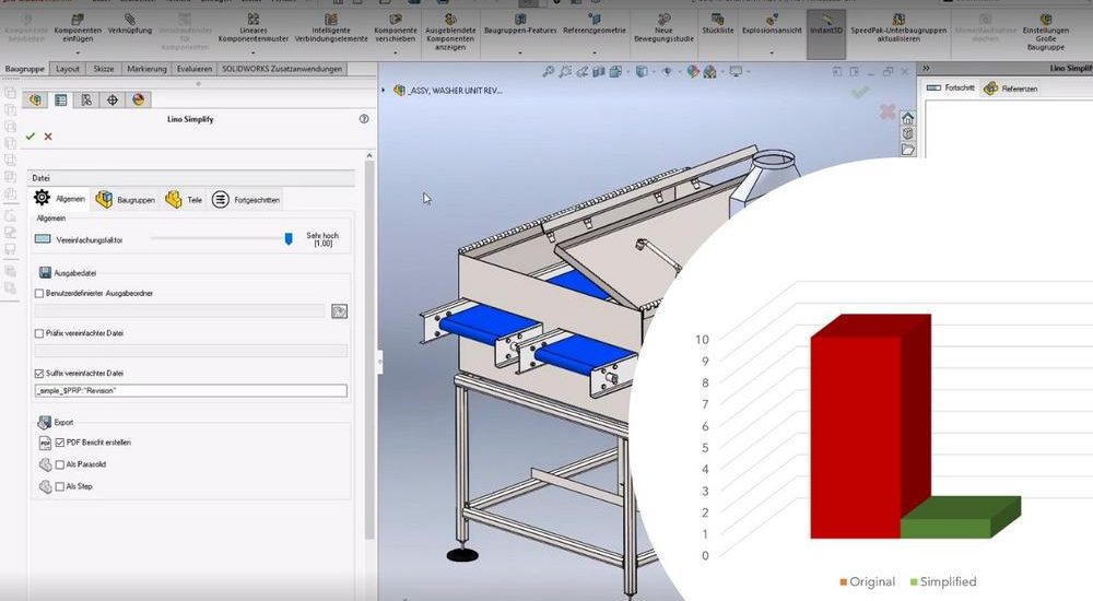 Die Vereinfachung erfolgt in einem vollautomatischen Prozess. Sobald die richtigen Einstellungen vorgenommen wurden, entfaltet Lino Simplify seine Wirkung. Die Solidworks-Zusatzapplikation funktioniert sowohl für Teile- als auch für Baugruppendateien und verarbeitet alle abhängigen Dateien als Teil des Vereinfachungsprozesses.