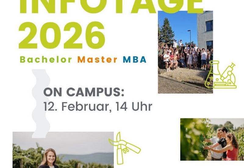 Passt ein Studium am Weincampus zu mir und was erwartet mich?Diese Frage wird am Infotag durch ein vielfältiges Programm „zum Anfassen“ geklärt. Die Studieninteressierten, ihre Familien und Freunde erwartet eine Schnuppervorlesung von Prof. Dr. Ulrich Fischer, eine Informationsbörse sowie ein Rundgang durch die Labore, Hörsäle und dem oenologischen Technikum. Alumni werden von ihrem Berufseinstieg berichten und Tipps für ein erfolgreiches Studium geben. Einblicke in die Weinsensorik wird ein Aromaparcours geben. In individuellen Beratungsgesprächen mit Lehrenden, Kooperationsbetrieben, der Landwirtschaftskammer und Studierenden können sich die Interessierten rund um Studieninhalte, Zulassungsvoraussetzungen und Auslandsaufenthalte informieren.