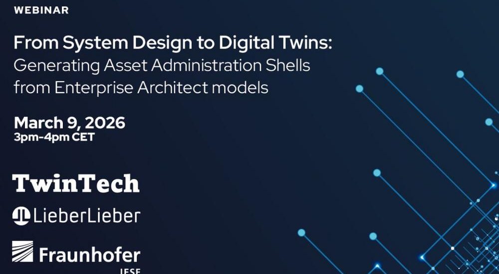 Together with our partners TwinTech and Fraunhofer IESE, we cordially invite you to attend the webinar ‘From System Design to Digital Twins: Generating Asset Administration Shells from Enterprise Architect models’ on Monday, 9 March 2026 (3:00 p.m. – 4:00 p.m.).