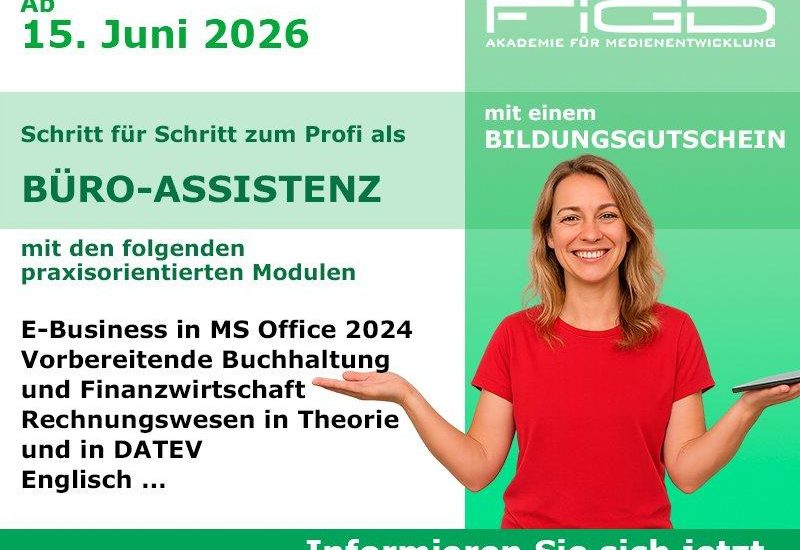 Wer sich beruflich neu orientieren und eine fundierte Qualifikation im kaufmännischen Bereich erwerben möchte, findet mit der Weiterbildung zur Büro-Assistenz an der FiGD Akademie eine praxisnahe und arbeitsmarktorientierte Möglichkeit für den Einstieg in moderne Büro- und Verwaltungsprozesse. Die Weiterbildung wird in Präsenz durchgeführt und richtet sich an Menschen, die sich gezielt auf organisatorische, kaufmännische und administrative Tätigkeiten vorbereiten möchten. Besonders attraktiv ist dabei die Möglichkeit, die Weiterbildung über den Bildungsgutschein vollständig fördern zu lassen.