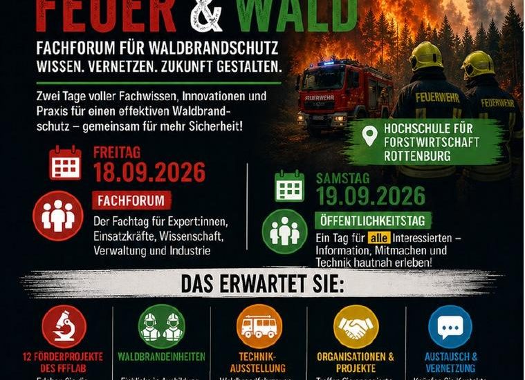 Bitte merken Sie sich bereits jetzt den Termin für unsere Veranstaltung „Feuer & Wald – Fachforum für Waldbrandschutz“ am 18. und 19. September 2026 vor. Unter dem Leitsatz „Wissen. Vernetzen. Zukunft gestalten.“ erwarten Sie zwei abwechslungsreiche Tage an der Hochschule für Forstwirtschaft Rottenburg: