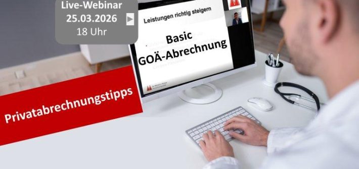 Einladung zum kostenlosen Live-Webinar am 25.03.2026: “Basic GOÄ-Abrechnung” Ihr Nutzen Sie erhalten einen fundierten Einstieg in die Grundlagen der Gebührenordnung für Ärzte (GOÄ). Sie lernen die wichtigsten rechtlichen Rahmenbedingungen, Begriffe und Abrechnungsgrundlagen kennen und schaffen damit eine solide Basis für die korrekte Anwendung der GOÄ im Praxisalltag. Profitieren auch Sie von unserer über 50-jährigen Erfahrung im […]