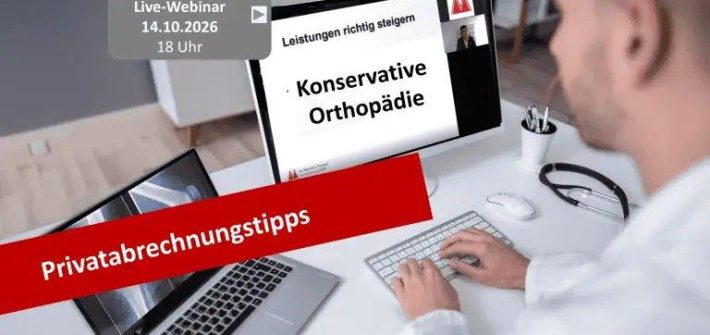 Live-Webinar-Reihe “Privatabrechnungstipps für Orthopäden – Allgemein” am 14.10.2026 Ihr Nutzen Die geplante Novelle der GOÄ beschäftigt derzeit die gesamte Ärzteschaft. In unserem Webinar erfahren Sie, welche Punkte der GOÄneu nach dem Ärztetag 2025 für die Orthopädie besonders relevant sind und wie Sie sich schon jetzt darauf einstellen können. Anhand von Praxisbeispielen der jetzigen GOÄ zeigen […]
