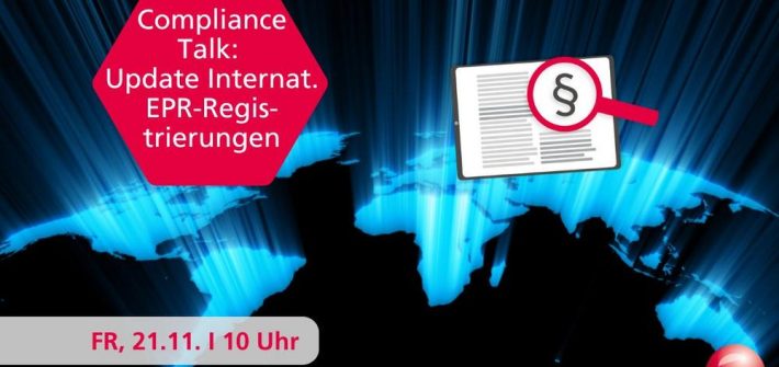 Compliance Talk im November: Update Internationale EPR-Registrierungen – Alles klar, oder noch Fragen? Save the Date! Kostenloses Live-Update am Freitag, 21. November, 10:00 Uhr EPR-Verpflichtungen entwickeln sich rasant – neue Vorgaben, neue Abfallströme, neue Länder. Wer international vertreibt, muss den Überblick behalten. Jetzt hier schon anmelden und vorbereitet sein! Eventdatum: Freitag, 21. November 2025 10:00 […]