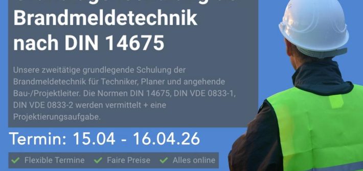 Grundlagenschulung der Brandmeldetechnik nach DIN 14675 Unsere zweitätige grundlegende Schulung der Brandmeldetechnik für Techniker, Planer und angehende Bau-/Projektleiter. Die Normen DIN 14675, DIN VDE 0833-1, DIN VDE 0833-2 werden vermittelt + eine Projektierungsaufgabe. Was ist der Vorteil der Grundlagenschulung? Die Grundlagenschulung ist die optimale Vorbereitung auf die Schulung zur Prüfung der verantwortlichen Person BMA. Wir sehen signifikant, dass […]