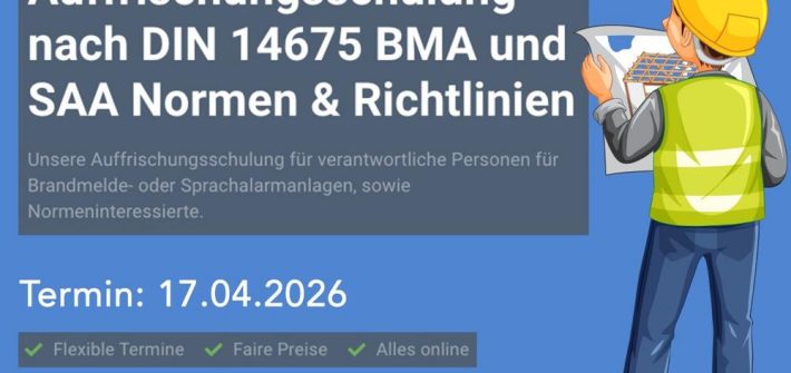 Unsere vollumfängliche Schulung zur verantwortlichen Person für Brandmeldeanlagen nach DIN 14675 Onlineschulung zur verantwortlichen Person für Brandmeldeanlagen nach DIN 14675: In jedem Unternehmen muss ein Mitarbeiter tätig sein, der die Prüfung zur verantwortlichen Person BMA nach DIN 14675 erfolgreich bestanden hat. Es ist völlig egal, bei welcher Gesellschaft Sie die Prüfung durchgeführt haben. Ab dem […]