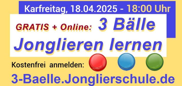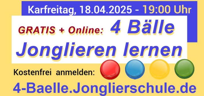 Wer schon sicher mit 3 Bällen jonglieren kann, bekommt hier GRATIS die Chance, bei Deutschlands erfolgreichstem Jongliertrainer, Stephan Ehlers, Schritt für Schritt die 4-Ball-Jonglage zu lernen! Eventdatum: Freitag, 18. April 2025 19:00 – 19:45 Eventort: Online Firmenkontakt und Herausgeber der Eventbeschreibung: FQL – Fröhlich Qualität LiefernLannerstr. 580638 MünchenTelefon: +49 (89) 171170-36Telefax: +49 (89) 171170-49http://www.FQL.de Weiterführende […]