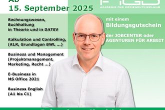 Die FiGD Akademie Berlin bietet ab dem 15. September 2025 eine Online-Weiterbildung in Rechnungswesen, Buchhaltung & Controlling an. Der Kurs läuft bis zum 21. November 2025 in Vollzeit (Montag bis Freitag, 08:30 – 15:30 Uhr) und ist zu 100 % mit einem Bildungsgutschein der Agentur für Arbeit oder des Jobcenters förderbar. Inhalte der Online-Weiterbildung Im […]