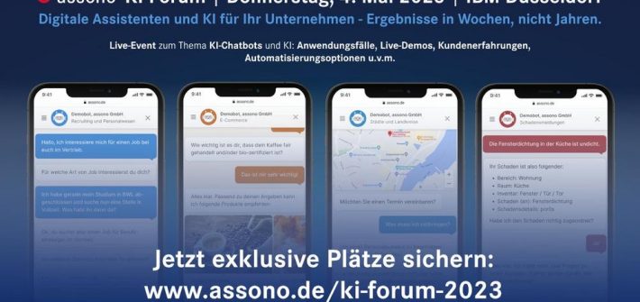 Digitale Assistenten und KI für Ihr Unternehmen – Ergebnisse in Wochen, nicht Jahren. Das assono KI-Forum ist ein exklusives Event für Entscheider und Projektverantwortliche für Digitalisierungsvorhaben. Nach den ausgebuchten assono KI-Foren in Hamburg und München geht es nun im Mai in Düsseldorf in die mittlerweile sechste Runde. Es erwarten Sie spannende Vorträge sowie ein reger […]