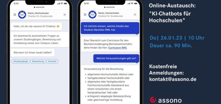 Am 26. Januar um 10 Uhr haben wir einen Online-Austausch zum Thema „Nutzen von KI-Chatbots für Hochschulen“ geplant. In dem kostenlosen Zoom-Meeting sprechen unsere Chatbot-Experten mit Ihnen über die Vorteile eines KI-Chatbots für Hochschulen, teilen Erfahrungswerte aus der Praxis und zeigen Ihnen eine Live-Demo. „Wann endet die Bewerbungsfirst? Welchen NC hat der Studiengang BWL? Wie […]
