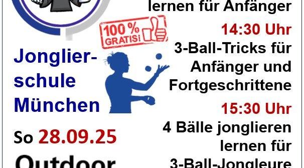 Am Sonntag, 28. September, verwandelt sich der Olympiapark München wieder in eine riesige Outdoorsport-Arena. Zum achten Mal warten beim Outdoorsportfestival den ganzen Tag über mehr als 50 Outdoor-Aktivitäten darauf, kennengelernt, getestet und vor allem direkt ausprobiert zu werden! Die Jonglierschule München ist als Aussteller dabei und bietet verschiedene GRATIS -Jonglier-Workshops für verschieden Zielgruppen an: 13:30 Uhr – 3 Bälle jonglieren lernen […]
