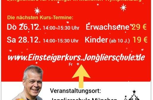In diesem JonglierKurs werden absolute Anfänger bei Stephan Ehlers, Deutschlands erfolgreichstem Jongliertrainer, in verblüffend kurzer Zeit das Grundmuster der Dreiball-Jonglage erlernen. Hierzu sind keinerlei Vorkenntnisse erforderlich. Das Mindestalter sollte 10 Jahre sein. Der Kurs ist für Kinder und Erwachsene und findet im kleinen Kreis mit max. 7 Teilnehmern statt in der Jonglierschule in München-Nymphenburg statt. Preis für Erwachsene: […]