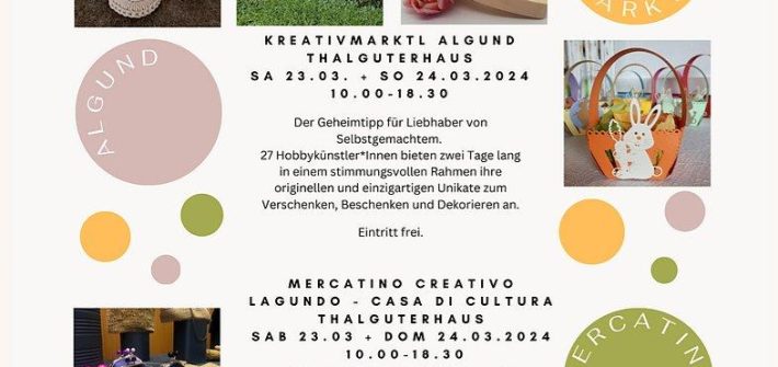 Nach ganz besonderen und originellen Geschenken und Dekoartikeln suchen, mit den 27 Hobbykünstlern plaudern und in gemütlicher Atmosphäre Zeit verbringen? Dann sind Sie hier genau richtig! Der Geheimtipp für Liebhaber von Selbstgemachtem. Wir erwarten euch zur dritten Osterausgabe des Kreativmarktls Algund! An den zwei Tagen zeigen euch 27 kreative Aussteller*Innen ihre vielen schönen, von Hand […]