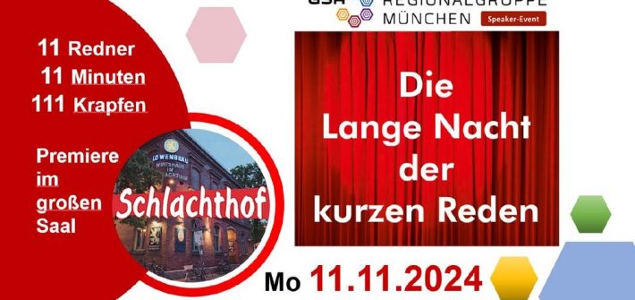 Nach den gelungenen Speaker-Events in den Jahren 2016, 2017, 2018 , 2019, 2021, 2022 und 2023 lädt die GSA-Regionalgruppe München am 11. November 2024 wieder zur „Langen Nacht der kurzen Reden“. 11 Speaker werden jeweils in 11 Minuten höchst unterschiedliche Themen vortragen. Auch in 2024 wird „Die Lange Nacht der kurzen Reden“ wieder im urig […]
